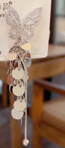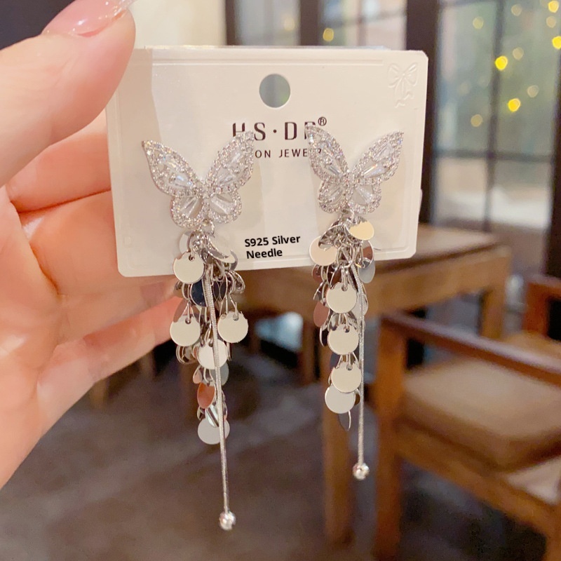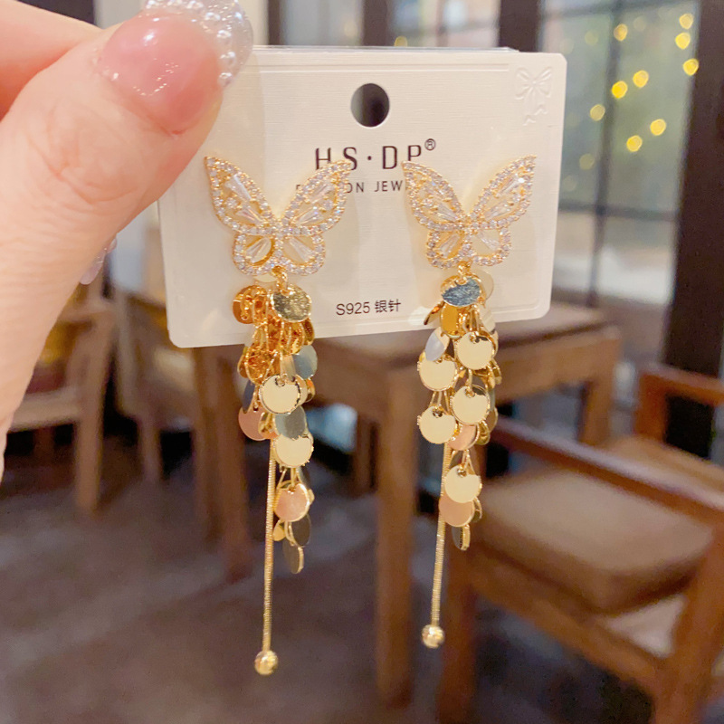 Female High-end Zircon Butterfly Disc Tassel Earrings