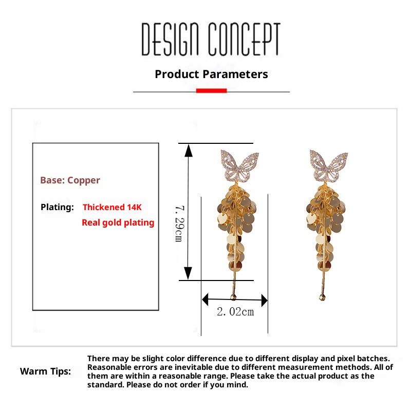 Color: gold zircon butterfly wafer tassel earlobe (thick real gold plating), silver zircon butterfly wafer tassel earlobe (thick real gold plating)